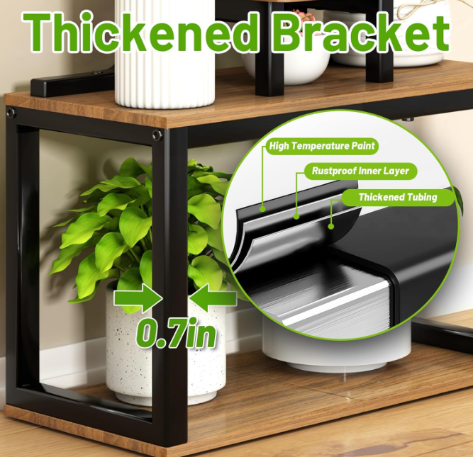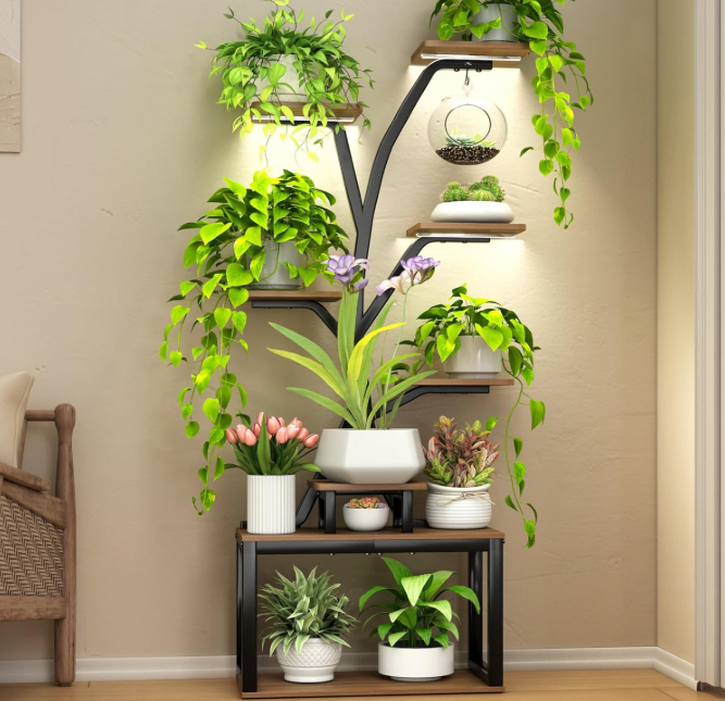 Built-in grow lights beneath select shelves cast a soft, warm halo over your plants, helping them thrive beyond the window and adding a gentle evening ambience. Two hanging points invite trailing pothos, ferns, or mini planters to float at the edges—adding movement and depth to your arrangement.