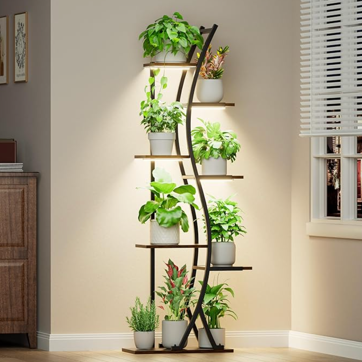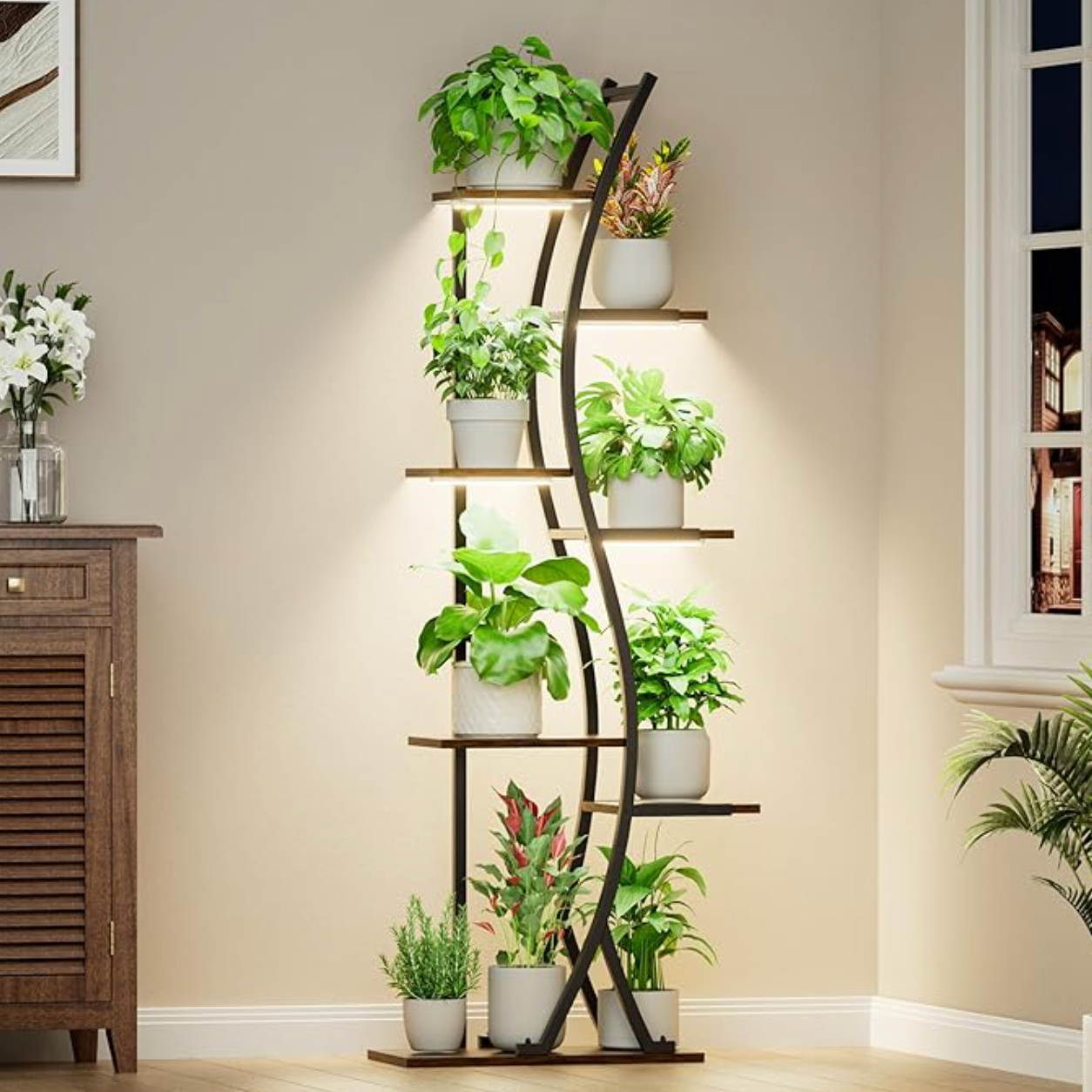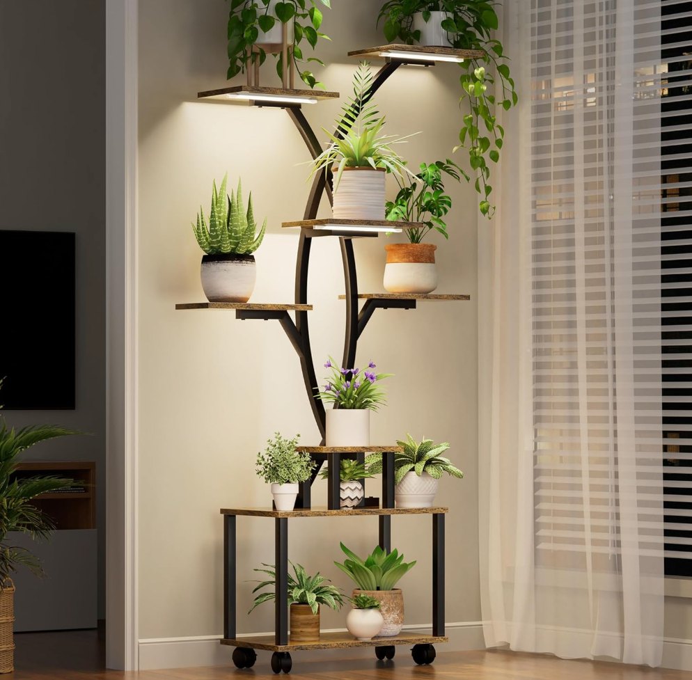 Crafted for the discerning plant curator, The Arvia Rolling Grove blends sculptural elegance with practical freedom. Its flowing treeform silhouette is accentuated by integrated soft-spectrum grow lights, ensuring every tier is both illuminated and alive.