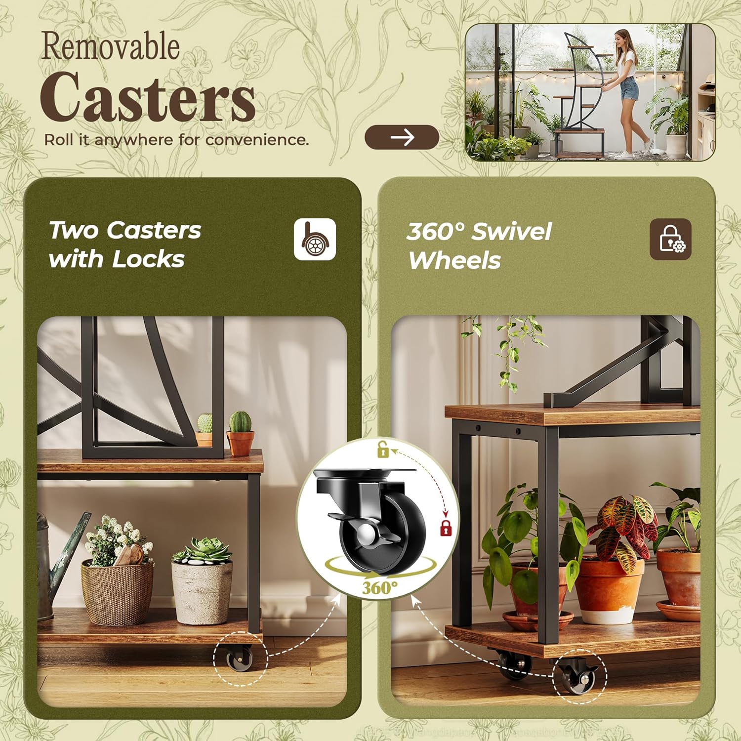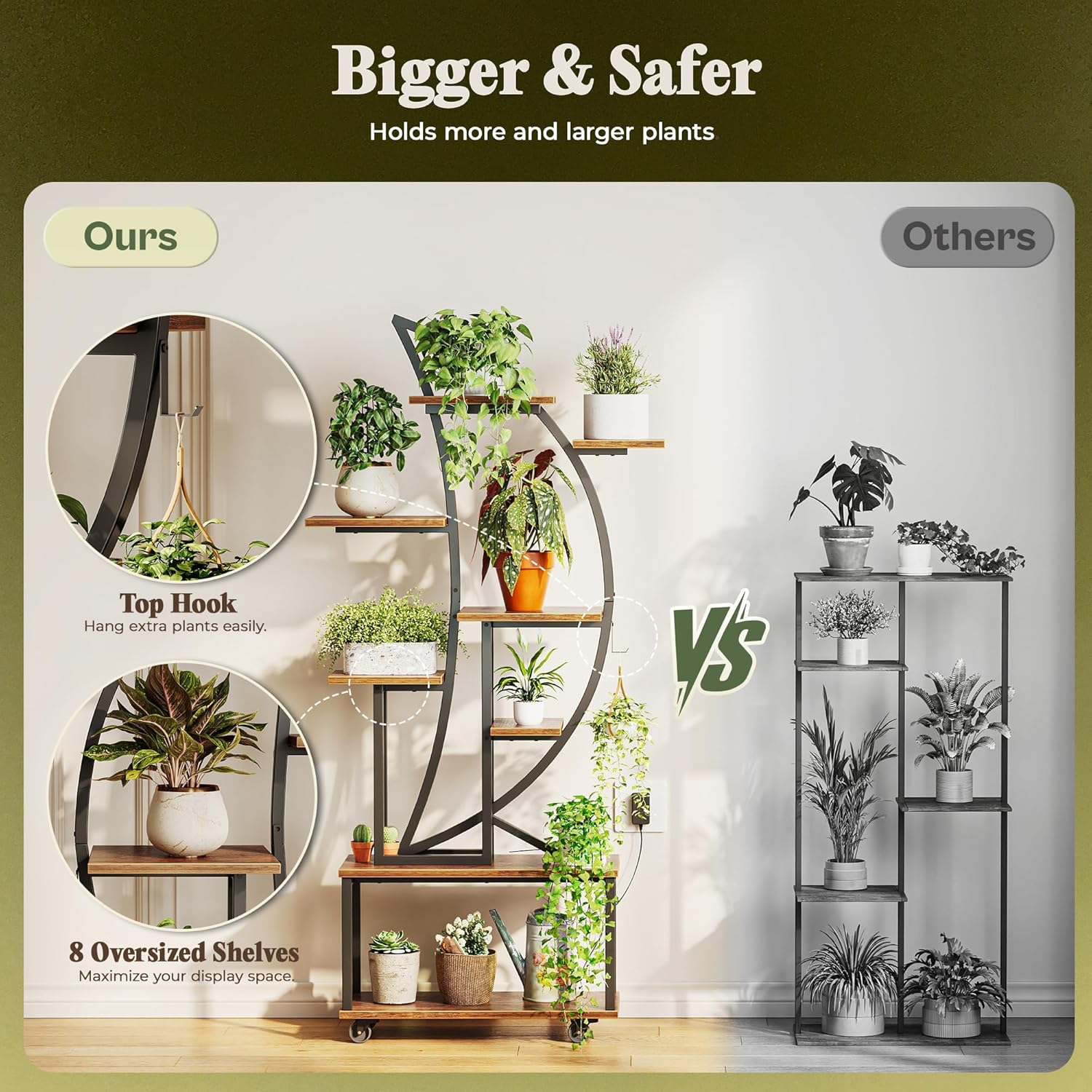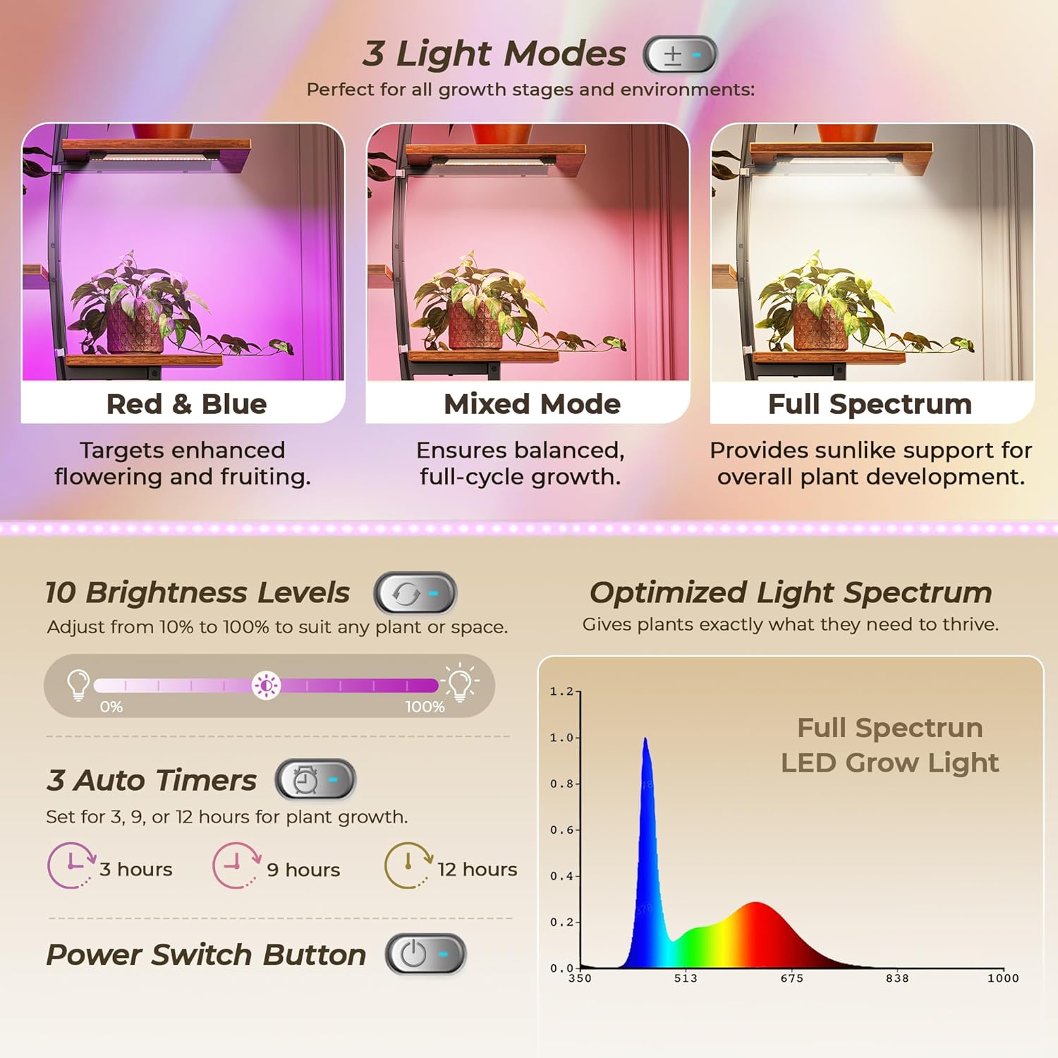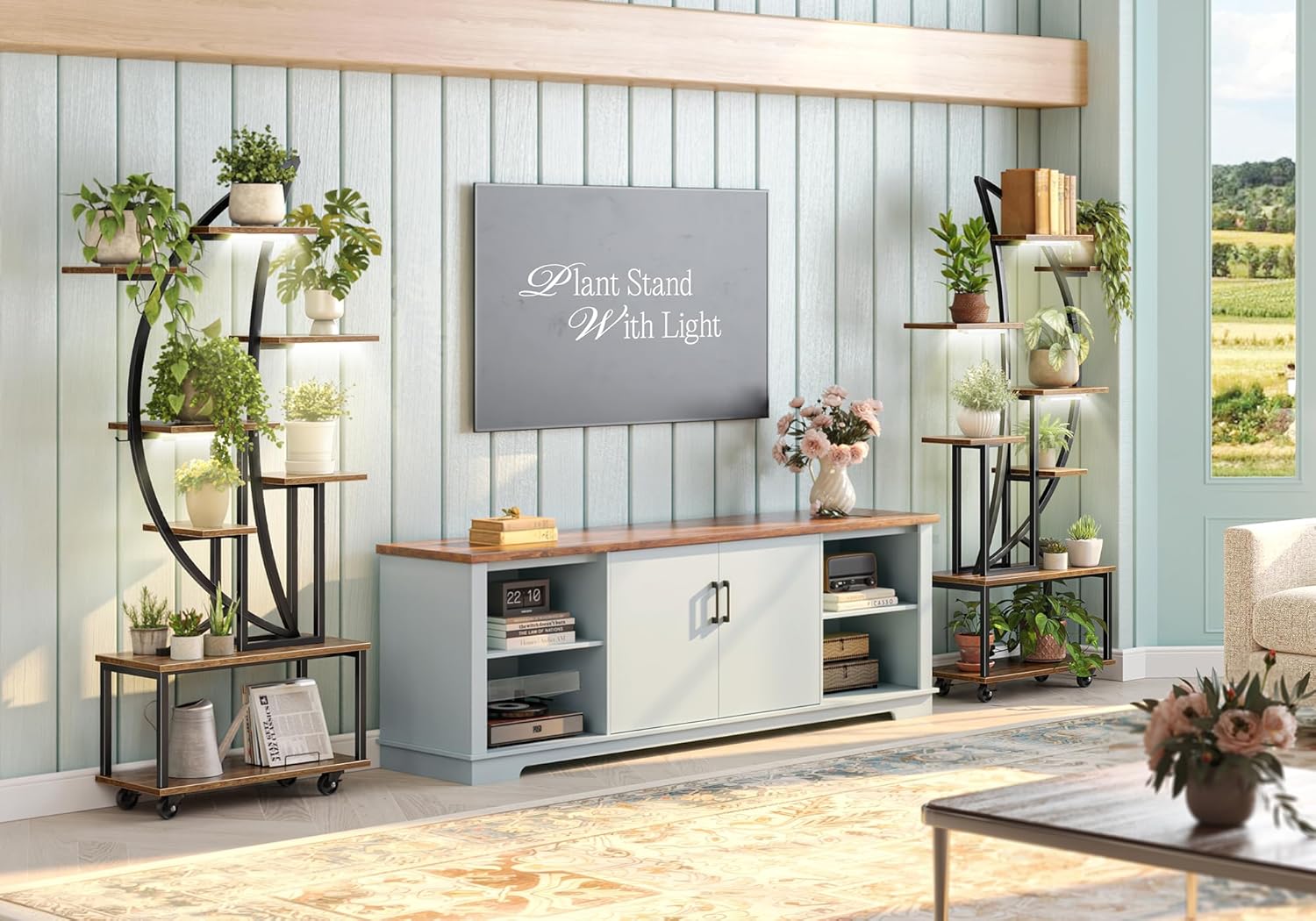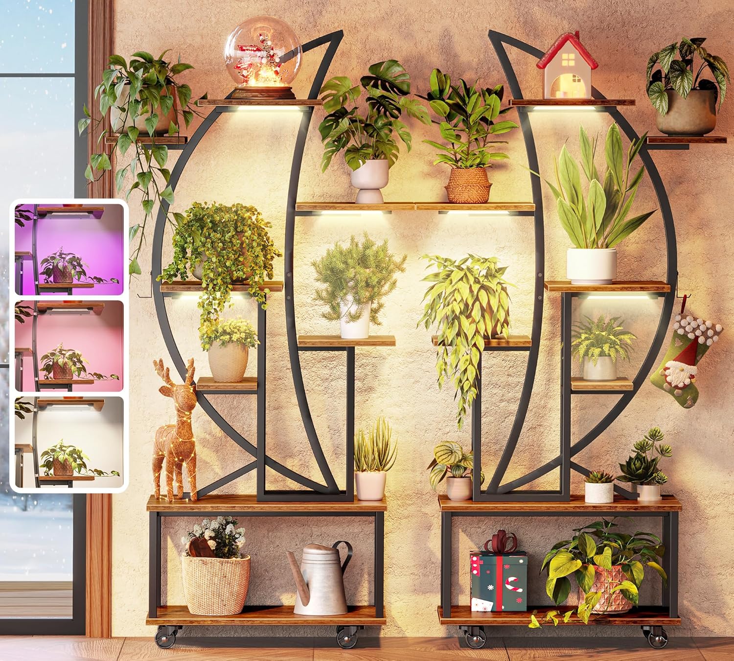 Thoughtfully balanced shelves showcase everything from trailing vines to statement foliage, while the integrated grow-light panels give every plant its own nurturing spotlight. Perfect for living rooms, reading nooks, or festive seasonal décor, this stand transforms any corner into a serene, glowing botanical display — equal parts art, architecture, and ambiance.