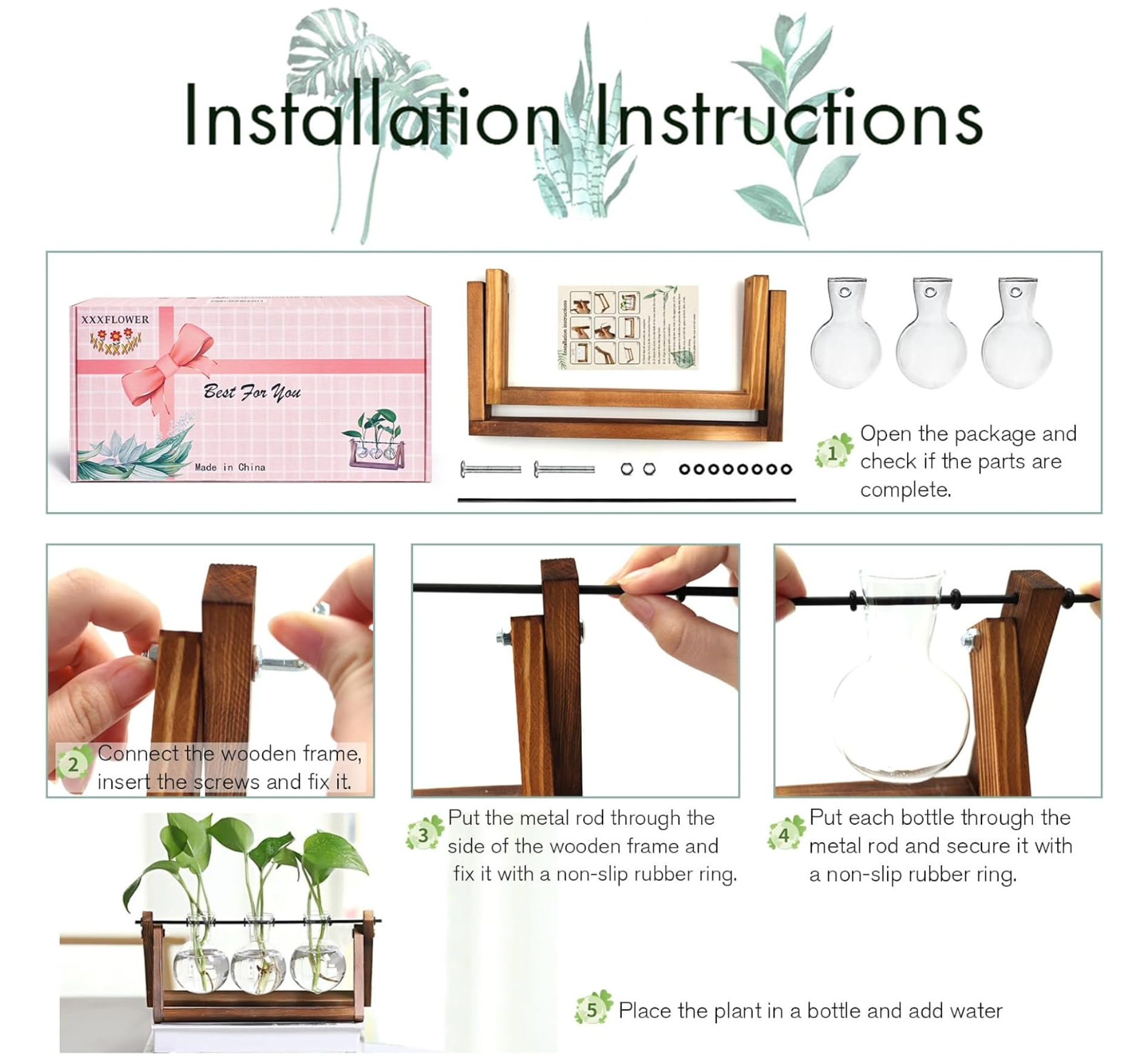 Crafted with a rustic wooden frame and three delicate glass bulbs, this minimalist setup is perfect for water propagation or displaying small floral arrangements. The swivel metal rod allows each vase to tilt gently for easy watering or cleaning.